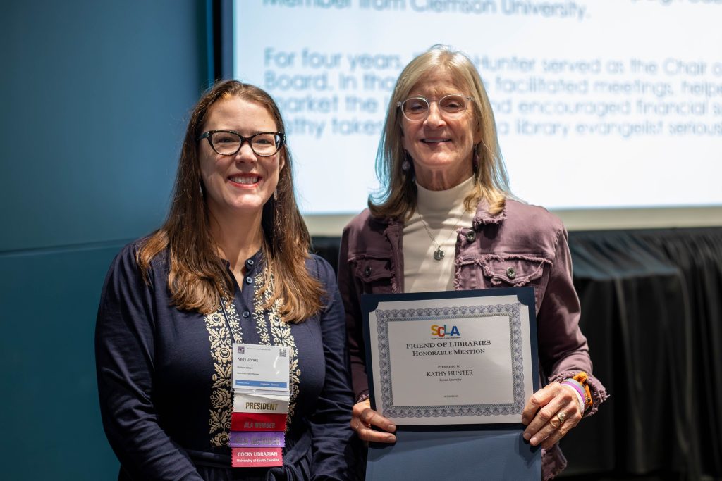 Recent retiree Teri Alexander and Clemson alumna Kathy Hunter were both recognized by the South Carolina Library Association (SCLA) at the 2025 SCLA Conference in Columbia in October.