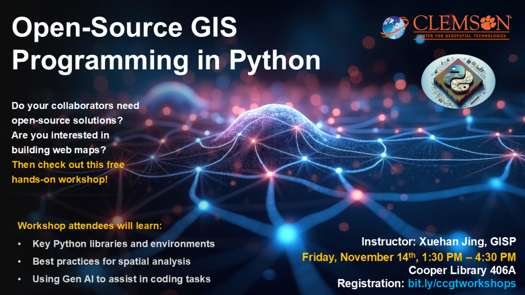 This fall, the Clemson Center for Geospatial Technologies (CCGT) will offer free in-person specialized workshops for all Clemson students, faculty, and staff.