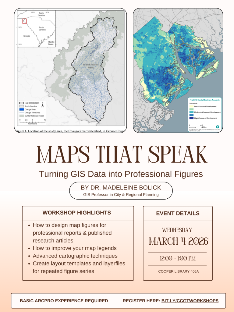 The Clemson Center for Geospatial Technologies will host a hands-on workshop, Maps that Speak: Turning GIS Data into Professional Figures, Wednesday, March 4, from noon to 1 p.m. in 406A Cooper Library. The workshop will be led by Dr. Madeleine Block, GIS Professor in City and Regional Planning. Participants will learn how to design map figures for professional reports and published research articles, improve map legends, apply advanced cartographic techniques, and create layout templates and layer files for repeated figure series using ArcGIS Pro.